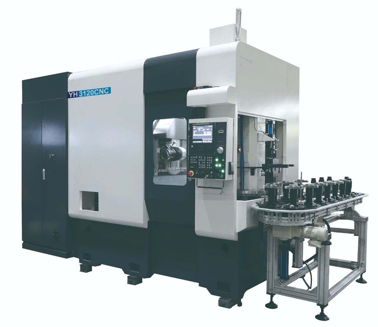 YH3120CNC干切滚齿机:YH3120CNC 为七轴四联动直驱干切滚齿机,刀具主轴和工件主轴采用直驱结构,高效、精度较好,适合新能源汽车齿轮大批量滚齿加工。